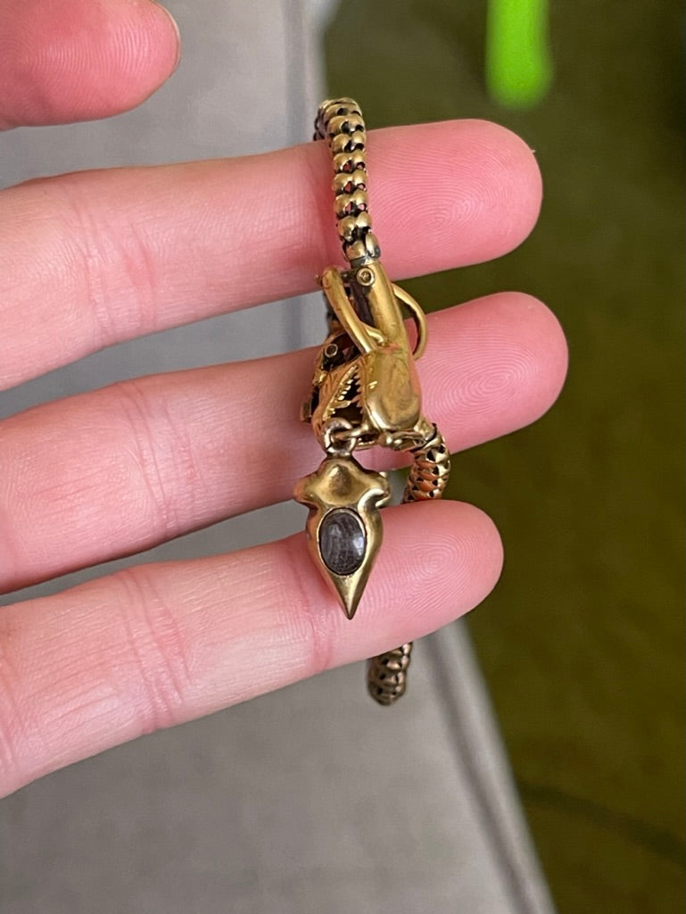 This is the most stunning Victorian snake bracelet. This piece features rose cut diamonds, old mine cut diamonds, and old mine cut rubies which I am confident are Burma no-heat. The Bracelet affixes into the side of the snake head and is secured by a clip.
