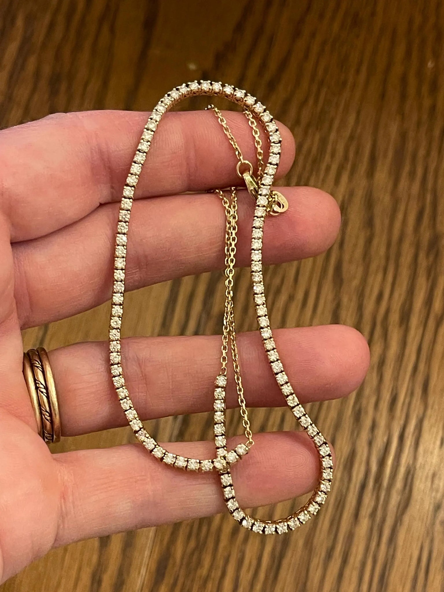 Everyone needs a diamond eternity necklace in their jewelry collection! This one happens to be a half eternity to be a more affordable price point but to still have the illusion of a full eternity necklace. It features 3.17 carats of F/G VS Diamonds set in a half eternity necklace setting which sits flush against the chest and cannot flip over so the diamond will always be the star! The Italian cable chain is 18" long and closes with a lobster clasp. It is wonderful to layer with other necklaces to create a knockout necklace suite. Please know that it is very difficult to capture the sparkle of this necklace in video, but trust me when I say that it sparkles like crazy!