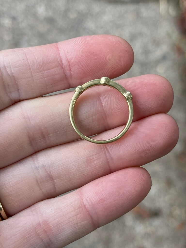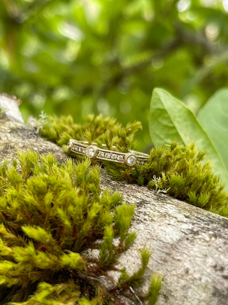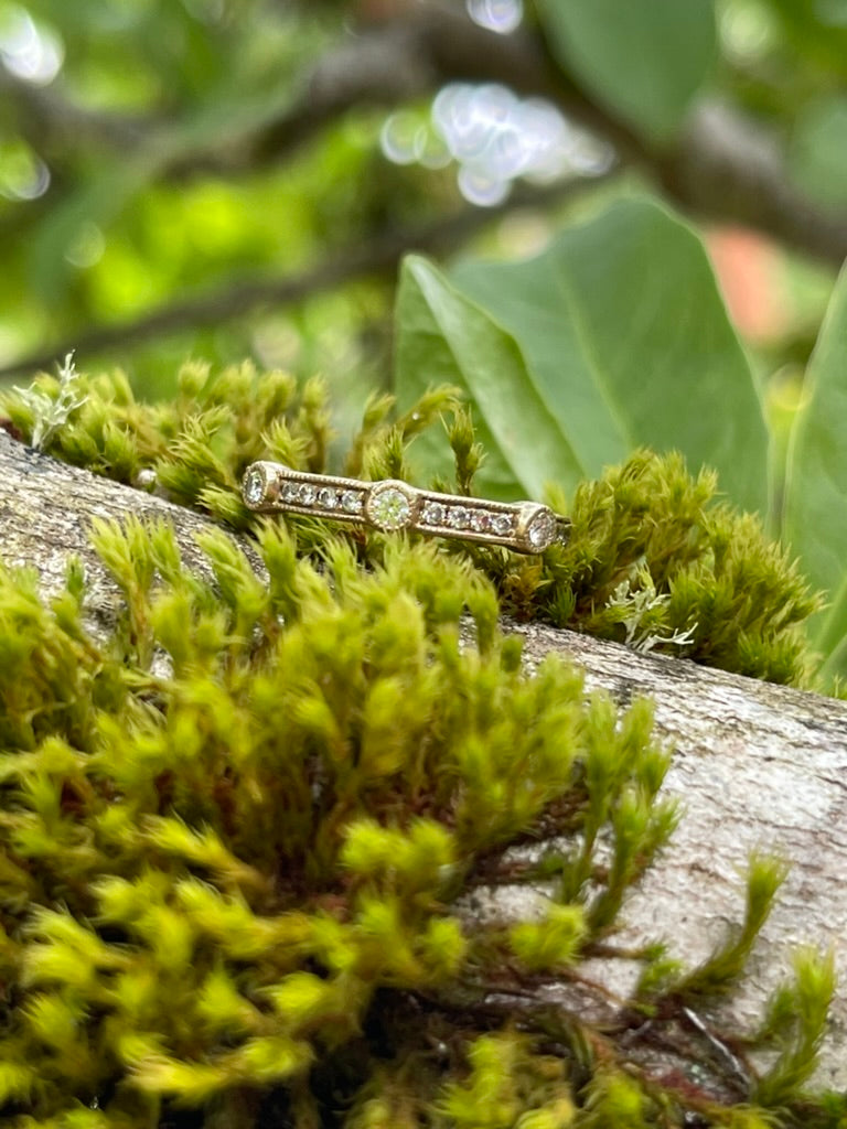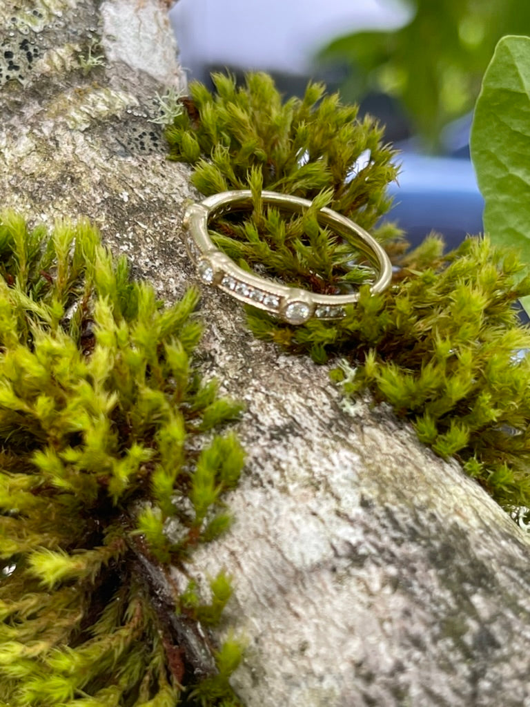 This ring is very sparkly. It features milgrain channel set modern round brilliants, accented by three bezel set modern round brilliants evenly spaced across the band. The ring, being vintage, has a nice patina to it. This would make an excellent wedding band or would be so fun to add to a ring stack.
